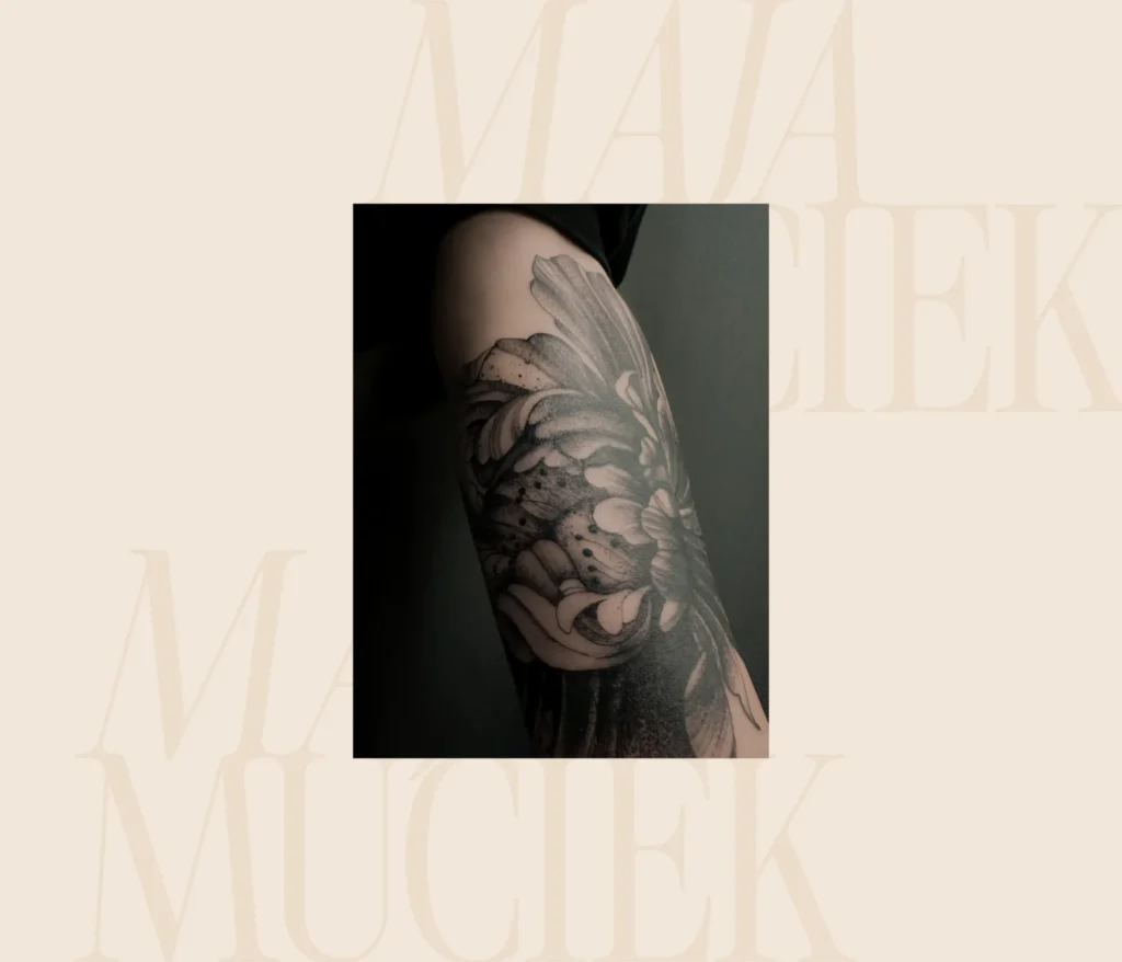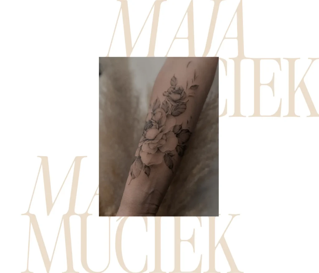 Subtelny i bardzo kobiecy projekt przedstawiający róże, wykonany w miękkim stylu black and grey na przedramieniu. Artystka postawiła na delikatne przejścia tonalne i niemal malarskie wykończenie płatków oraz liści. Jest to elegancka, klasyczna kompozycja, która wyróżnia się czystością wykonania i dbałością o detale.