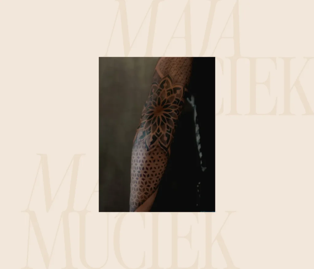 Jest to precyzyjny tatuaż geometryczny, którego centralnym punktem jest misterna mandala idealnie wkomponowana w okolicę łokcia. Wzór płynnie przechodzi w drobniejsze, powtarzalne motywy graficzne na przedramieniu, tworząc spójny „rękaw”. Technika dotworku zapewnia tutaj subtelne przejścia tonalne i wysoką estetykę detalu.