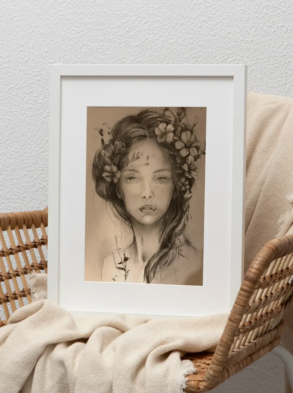 Ta kompozycja przedstawia dynamiczny motyw roślinny z wyraźnym cieniowaniem typu whip-shading, które nadaje płatkom tekstury. Praca charakteryzuje się mocnym kontrastem czerni i bieli, co buduje dużą głębię obrazu. Całość jest nowoczesną, ekspresyjną interpretacją klasycznego tematu florystycznego.